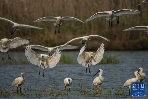 4月8日,黑脸琵鹭在福建省闽江河口湿地嬉戏。新华社记者 梅永存 摄