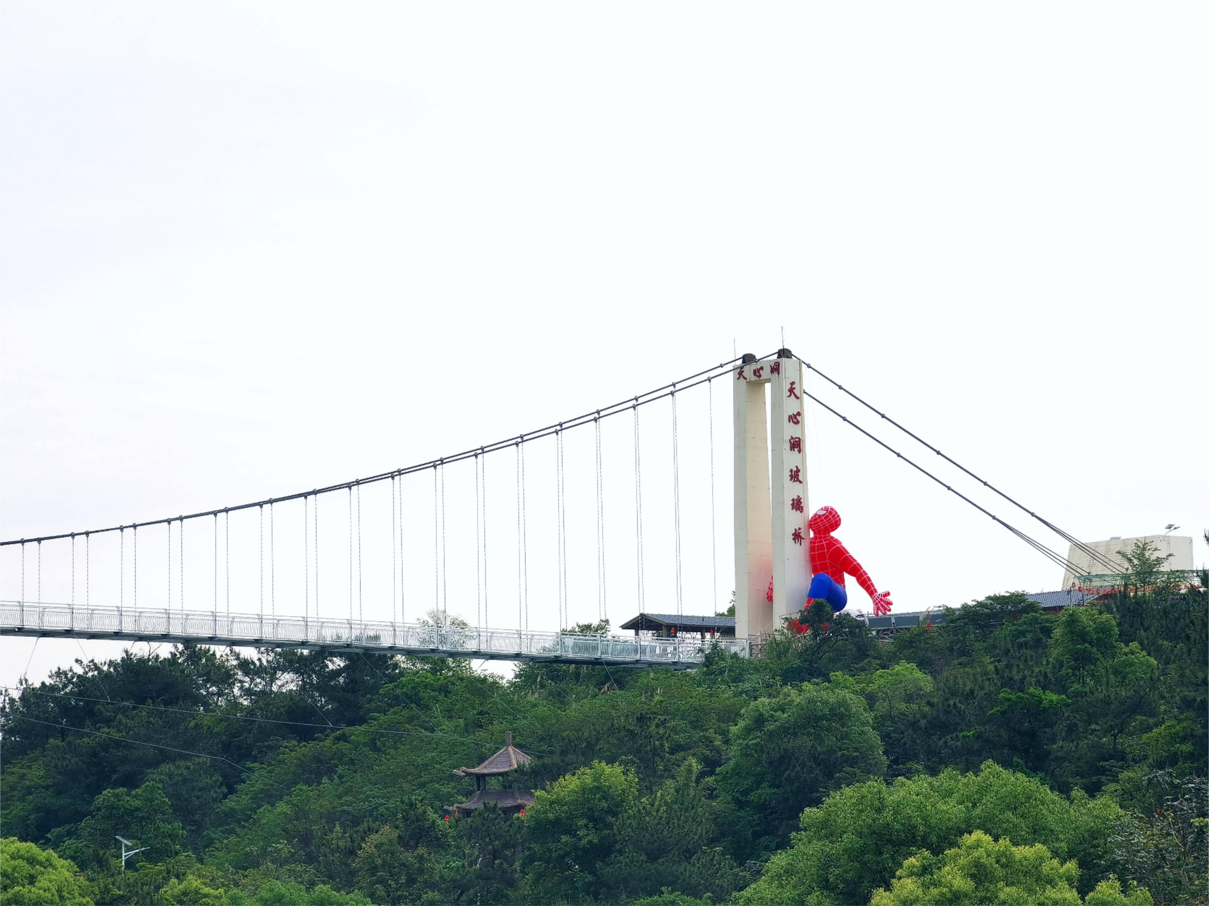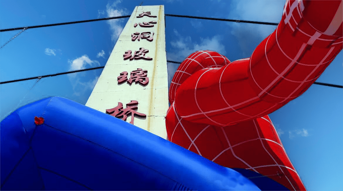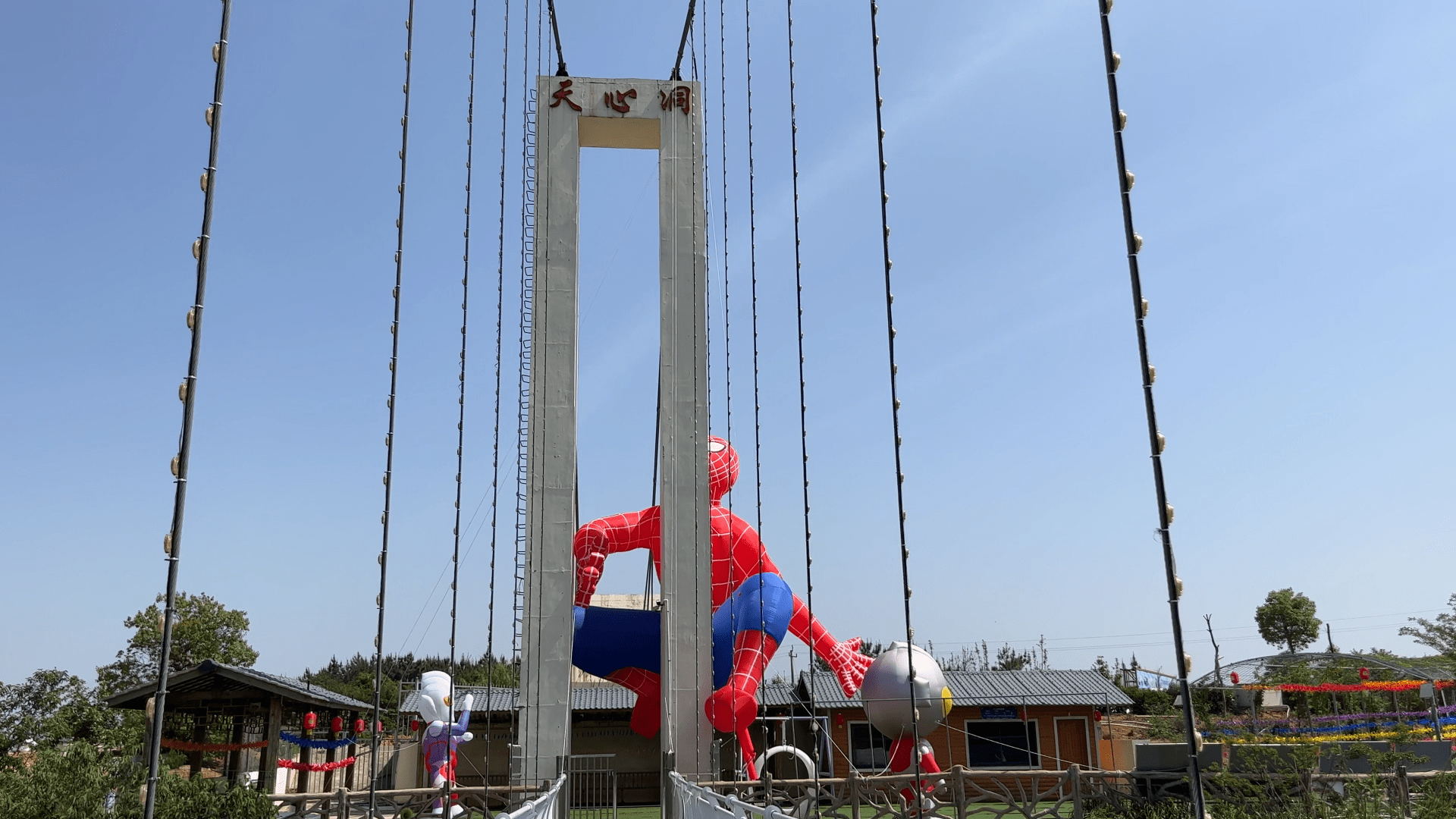 他们有超级英雄蜘蛛侠、奥特曼打怪兽、小猪佩奇、机器猫、超级飞侠、汪汪队···其中蜘蛛侠更是紧紧的匍匐在天心洞高空玻璃桥的桥墩之上,营造出蓄势攀爬的动感气势。
