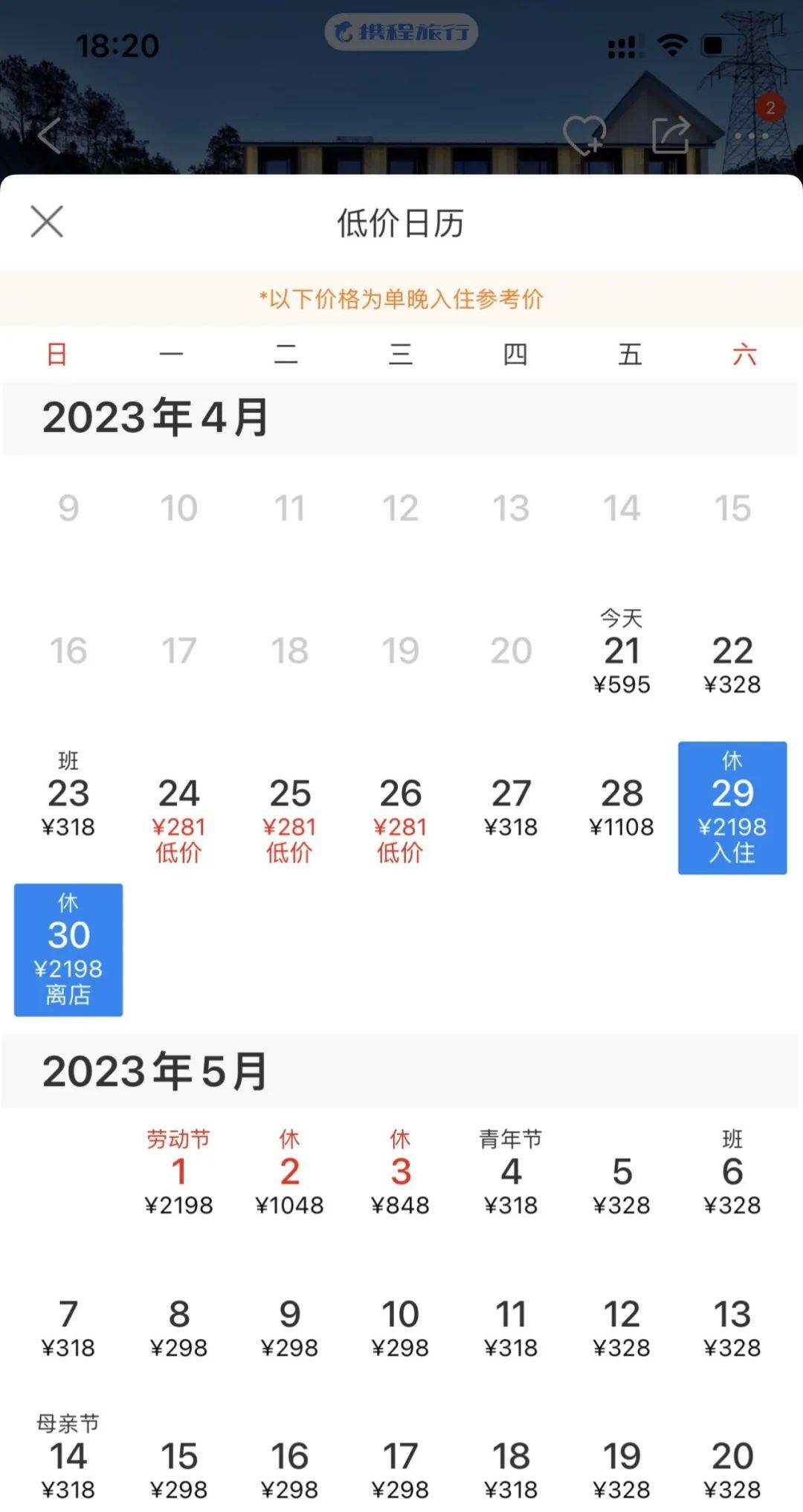某家位于景德镇的四钻酒店看起来“五一”假期和平日的价差更大。澎湃新闻搜索发现,该酒店4月、5月平日最低能订到300元/晚左右的房间,甚至“五一”前一周有房型的最低价300元不到,仅281元/晚,而4月29日至5月1日最低仅能订到2198元的房间。