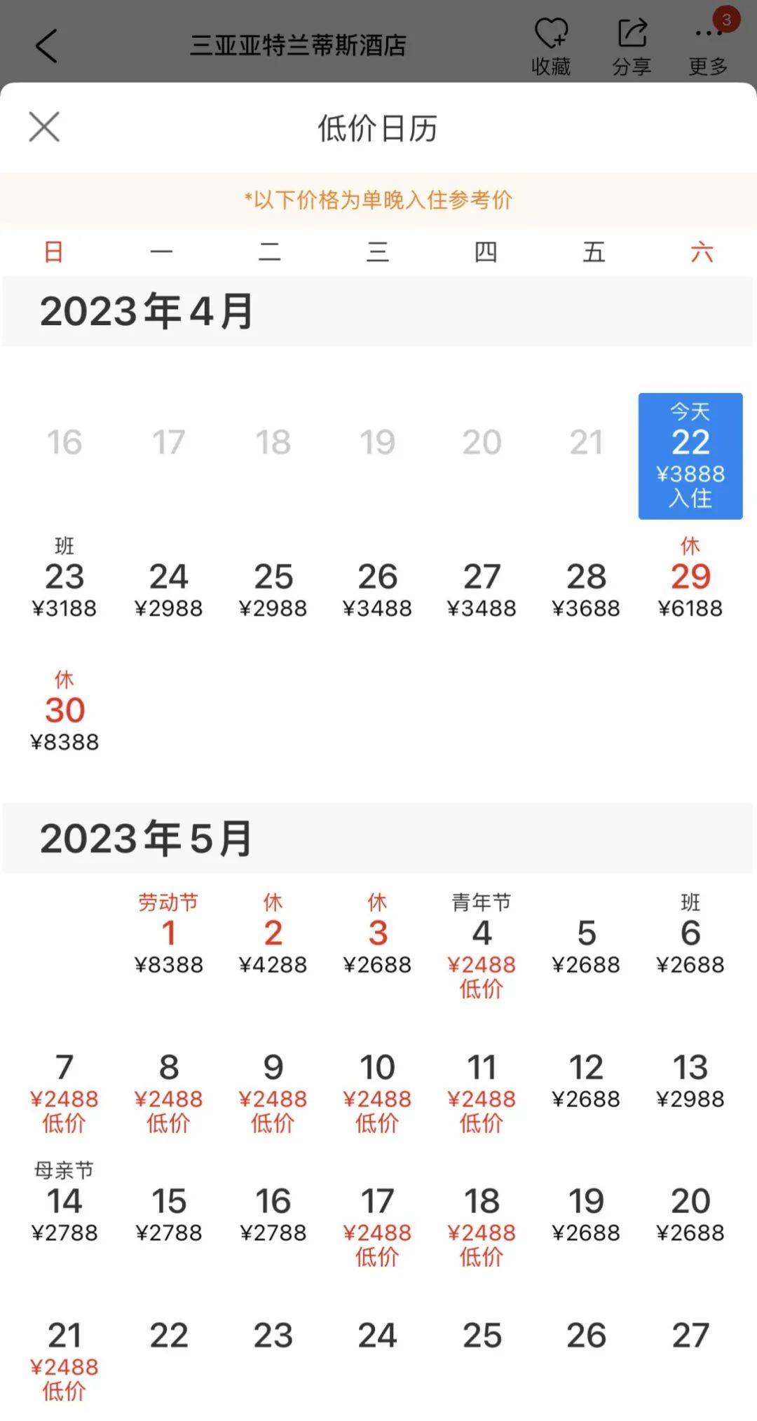 三亚亚特兰蒂斯酒店4月、5月平日最低房价为2488元/晚,目前4月29日能够入住的最低房价为6188元/晚,4月30日和5月1日的最低入住价格达8388元/晚。