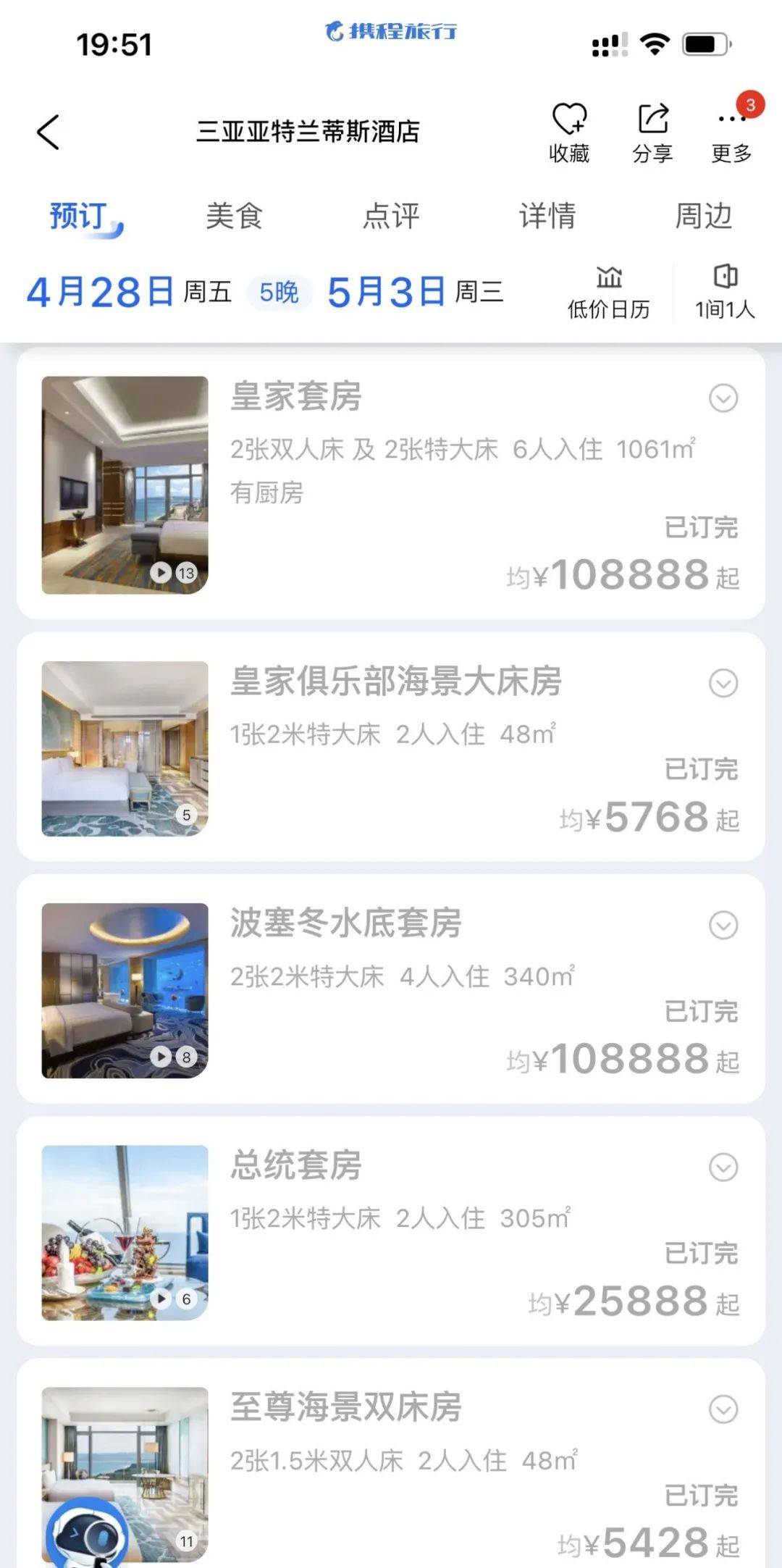 不过,澎湃新闻发现,截至目前,三亚亚特兰蒂斯平日最便宜的海景双床房和海景大床房在4月28日至5月3日均已订完,4月29日最低房价6188元/晚的皇家俱乐部海景大/双床房平日最低价格为3288元/晚起。