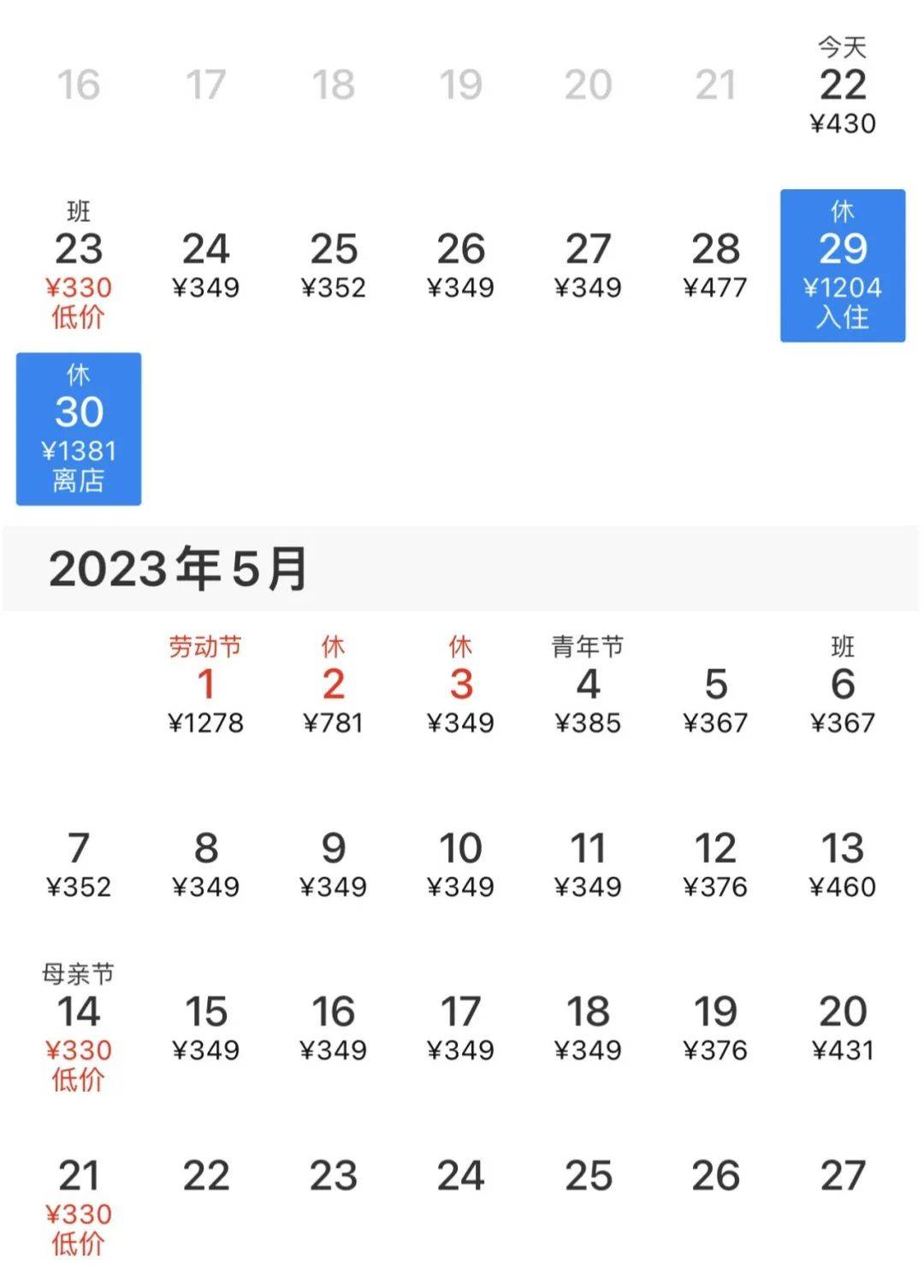 以苏州观前街附近的酒店为例,平日最低房价约350元/晚的某连锁酒店4月29日最低入住价格为1204元/晚,是平日价格的3.44倍;4月30日的入住价格为1381元/晚,是平日价格的约3.9倍。