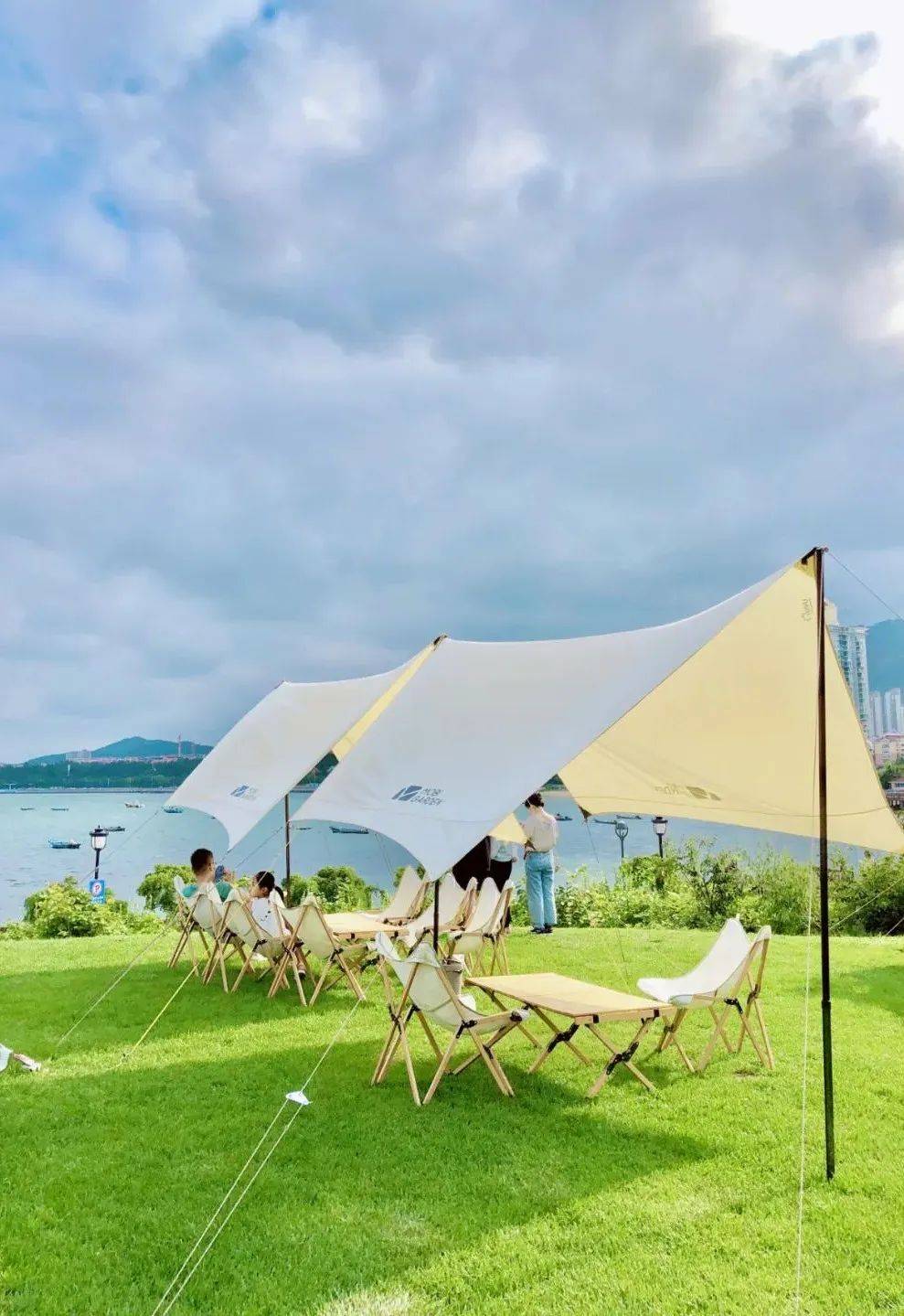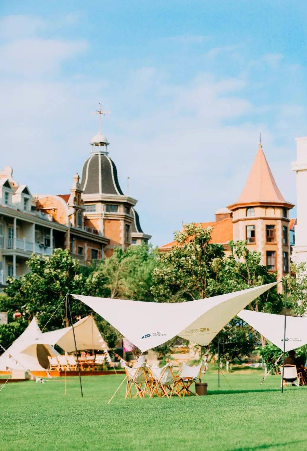 要想拍出更加文艺的照片,可以去烟台海昌渔人码头内的「听海野奢」营地,面朝大海,观海听风!郁郁葱葱的草坪和大大小小的户外帐篷映入眼帘,野趣十足。