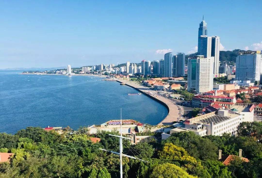 从烟台山远眺下的烟台风景碧海蓝天,郁郁葱葱,山下改造一新的老街朝阳街散发百年风情。