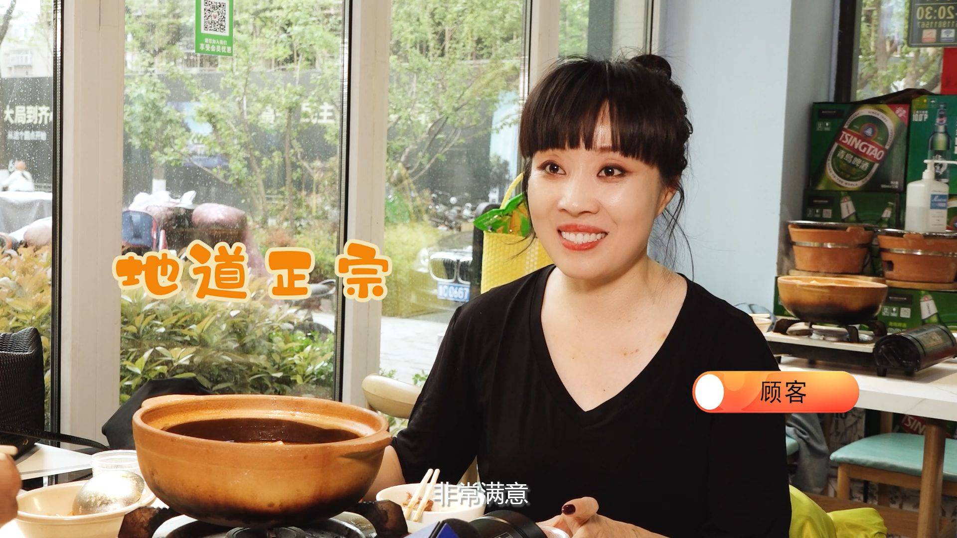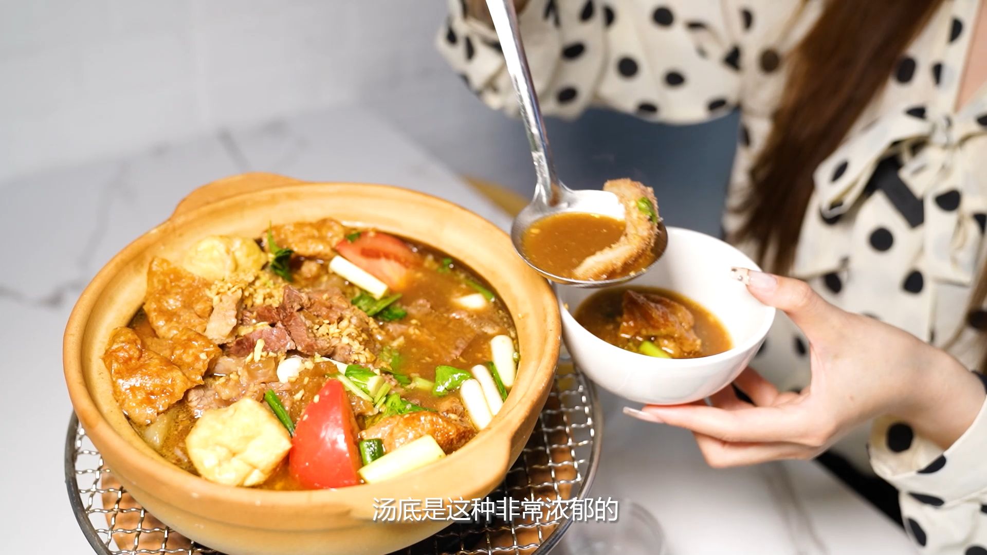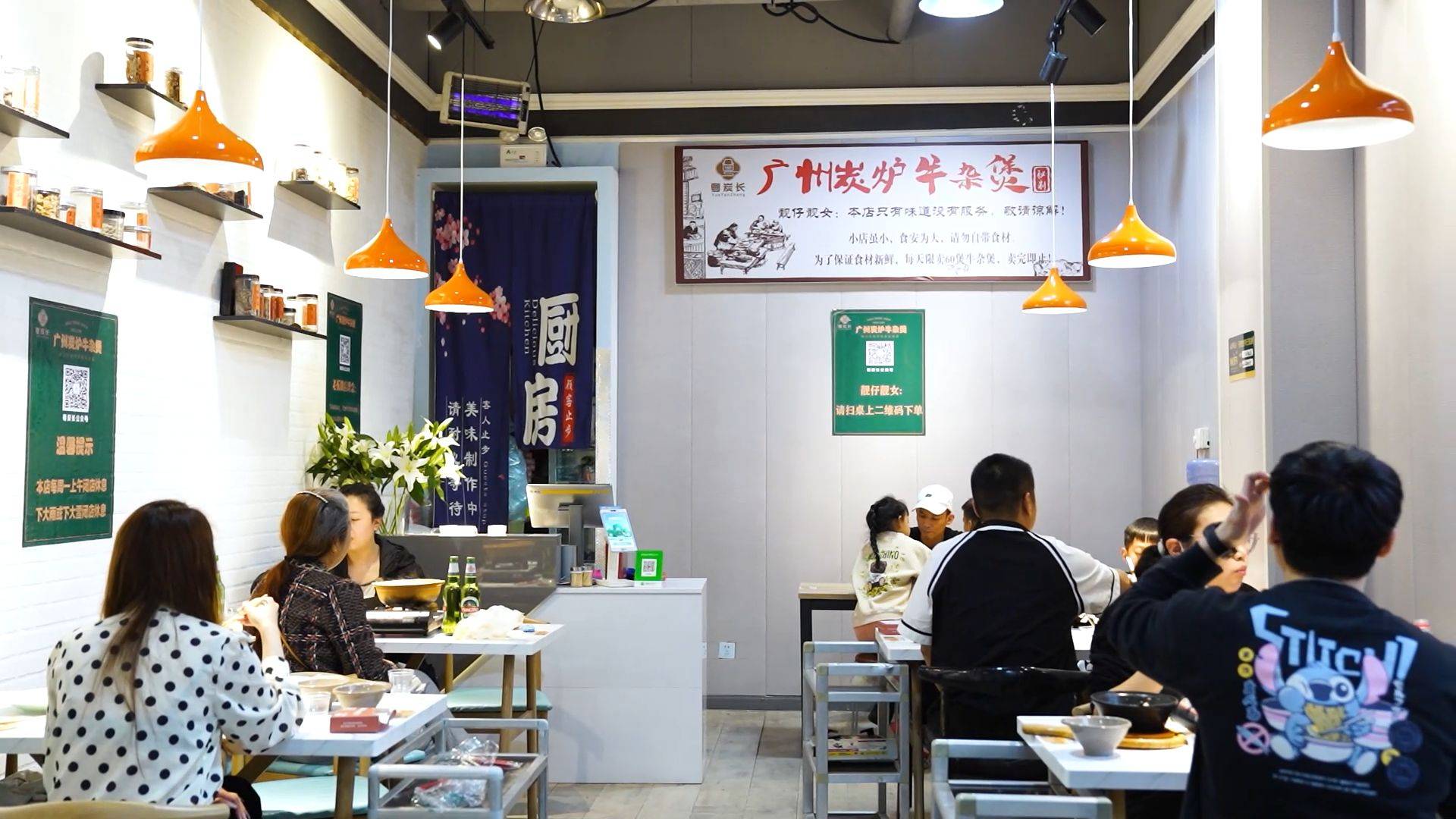 主持人:他们家一进门就闻到香味了,这么一个牛杂煲在炭炉上咕噜咕噜冒着热气,热气腾腾的。他们家是非常地道的老广东口味,汤底是这种非常浓郁的。里面的牛杂都炖煮了三个小时以上,非常的软烂入味,份量很足,关键是价格还很实惠。