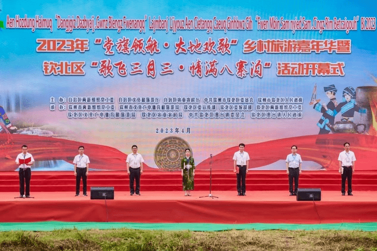 4月22日,2023年“党旗领航·大地欢歌”乡村旅游嘉年华暨钦北区“歌飞三月三·情满八寨沟”活动开幕式在钦州市钦北区举行。