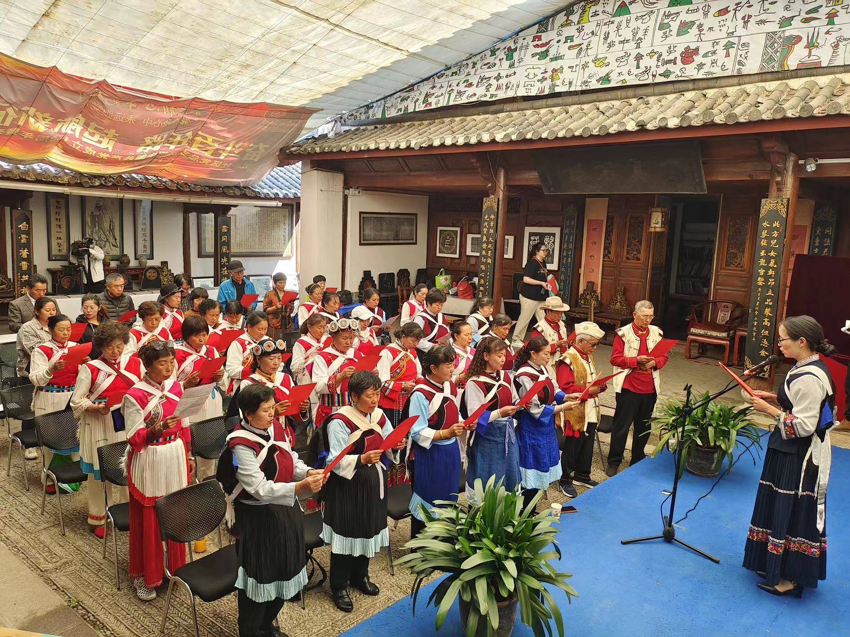 当天,各大图书馆在玉河广场通过实物、展板、宣讲等方式开展丽江古籍文献展出活动,让人沉浸式感受丽江浓郁的文化氛围和文化魅力。下午两点,玉河广场一角,纳西古乐老艺人现场传唱工尺谱,孩子们跟着老师吟唱,吸引了不少游客驻足观看。