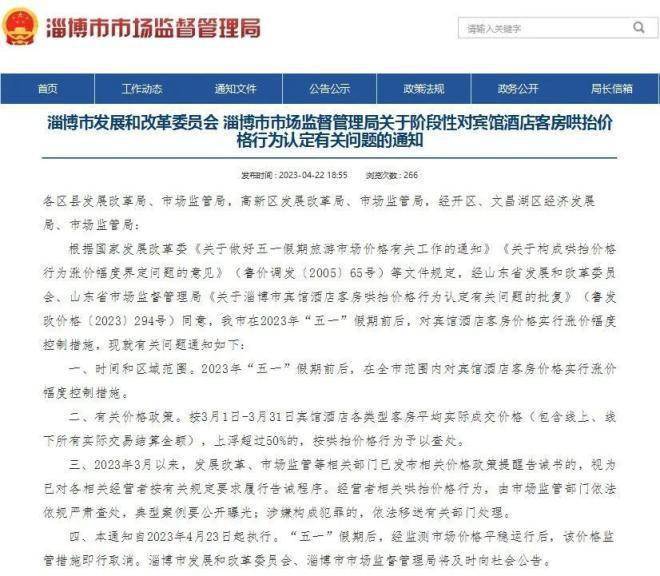 最近因烧烤大火的旅游城市淄博,已为五一前后酒店涨价幅度“限高”。4月22日,淄博市市场监督管理局网站公布的一则通知显示,按3月1日至3月31日宾馆酒店各类型客房平均实际成交价格计算,五一期间上浮超过50%的,将按哄抬价格行为予以查处。自3月初走红全网后,淄博烧烤已成为当之无愧的网红顶流。五一假期,淄博必将迎大批游客前来“拔草”,此时警示酒店涨价莫任性,是用实实在在的方式,对即将到来的高峰客流表示欢迎。