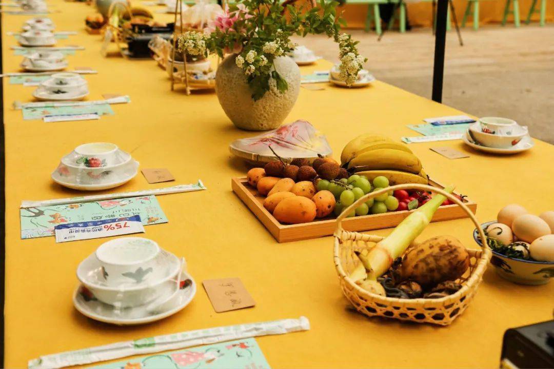 2023年的”三月三·长桌宴”搭建”回”字型的长桌,”回”字连接着燕子飞翔的舞台,构成春回大地、生活回到之前、民俗回到今天、一切得以顺利回归的美妙寓意。街坊邻舍、艺术家们欢聚一堂,在此传承”聚宗亲,商族事,祈丰收,保平安”的风俗。