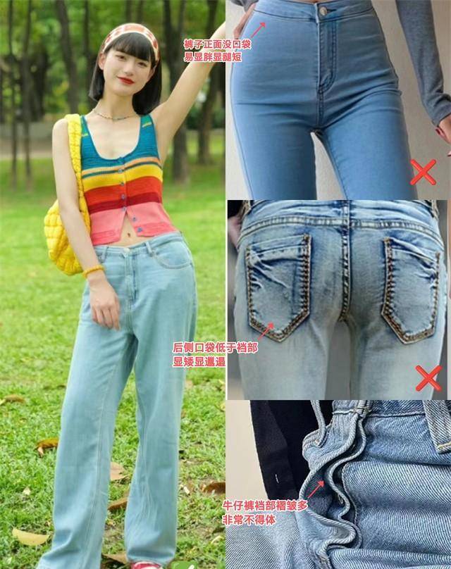 侧面没口袋、后侧口袋低于裆部或裤裆部褶皱多的牛仔裤穿起来廉价显胖。除了最基本的h型阔腿裤外,臀部饱满的姐妹还可尝试喇叭牛仔裤哟~