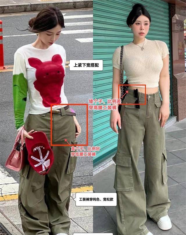 个子高、比例好就学虞书欣穿低腰工装裤;矮个子比例差,就要穿高腰工装裤。上紧下宽、配浅色或厚底鞋增高是工装裤的常用穿法;纯色或宽松过踝款是工装裤翻牌率最高的款式哟~