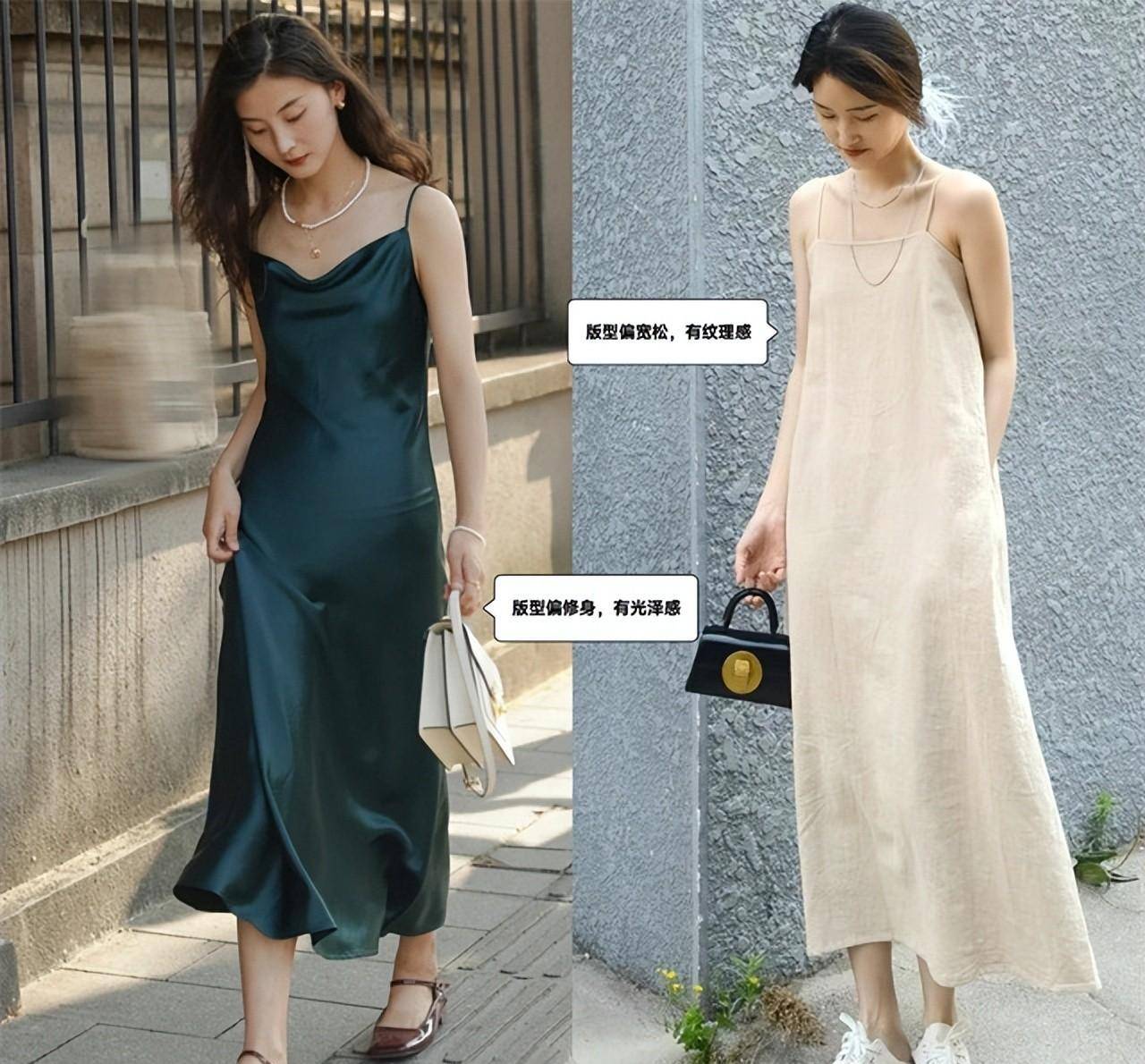 会挑衣服的姐妹在吊带裙的面料上也有“小心机”。想凸显优雅,就优先选择有光泽感的真丝或缎面类吊带裙,配合细吊带或微修身设计更贵气。