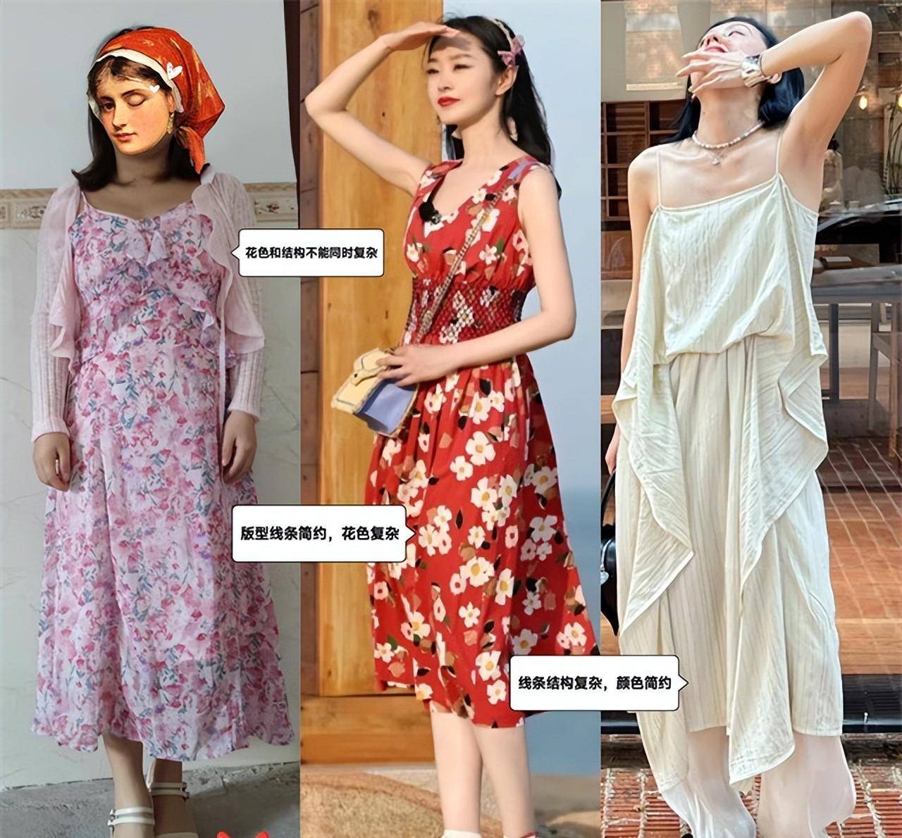 一定要选线条连贯的吊带长裙,花色和服装的线条结构不可同时冗杂。若选择复杂的印花或扎染图案,线条就要简单;有曲线条或复杂结构,花色就得简约,最好选纯色或浅色系。