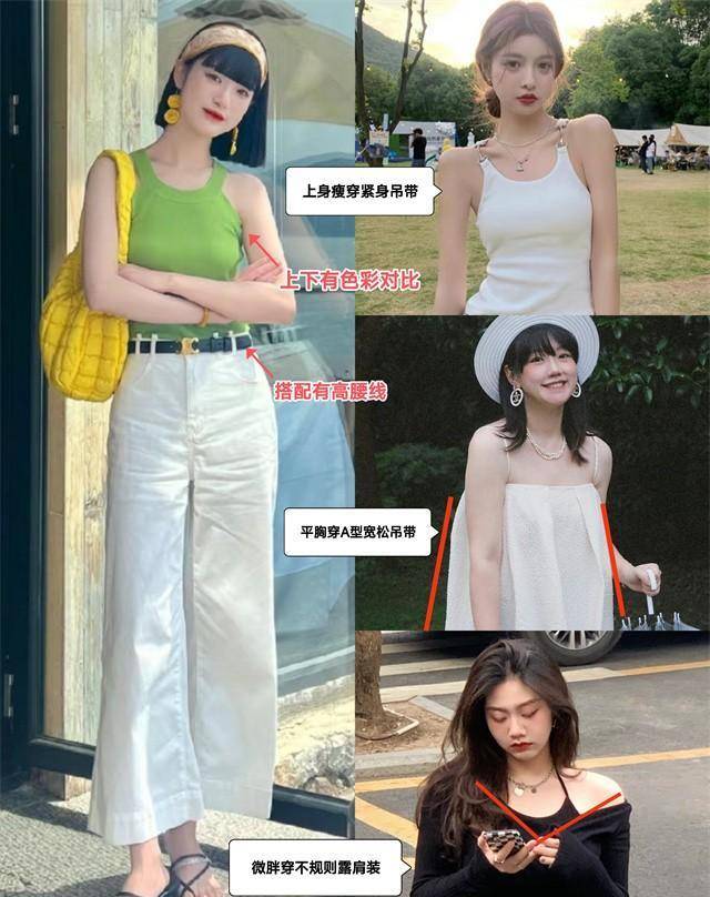 上身瘦削就穿紧身吊带,平胸就穿A型宽松吊带,微胖就选不规则、肩颈位置带斜线条的露肩装。这些上衣与下装有色彩对比,加上高腰线后更是美到不行~