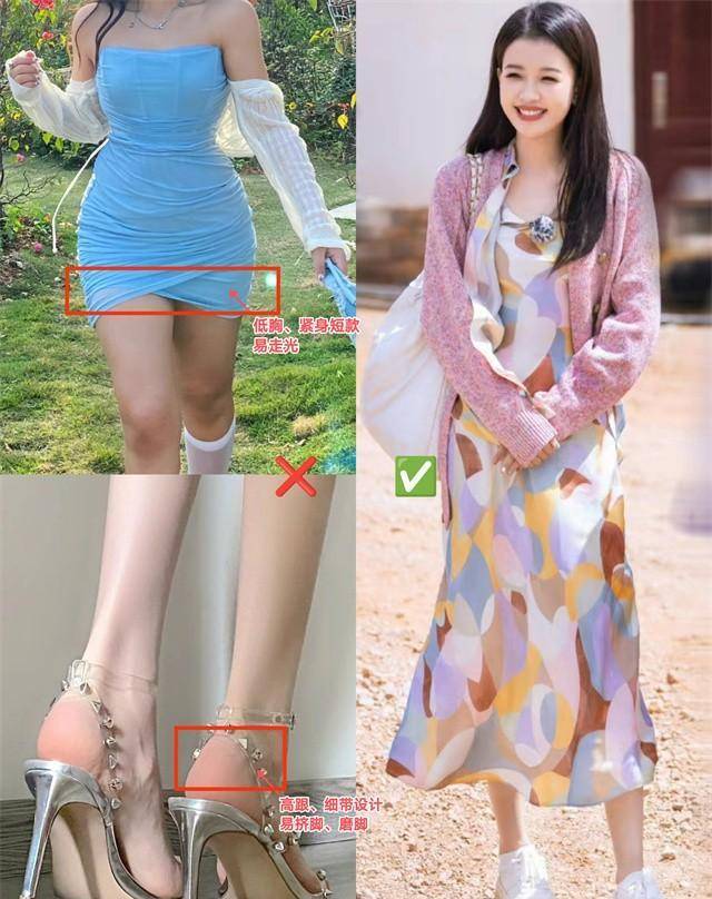 低胸、过于紧身的短款设计穿起来虽美却容易走光;高跟鞋、细带鞋等鞋跟太高、不贴脚的鞋子也不适合长时间行动,穿久了就会挤脚磨脚,都不是五一出游穿搭的最佳选择。