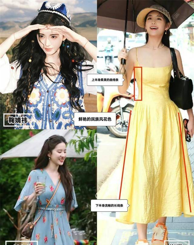 鞠婧祎和刘亦菲在旅游时都选了鲜艳的民族风花色服装;谢娜这套吊带连衣裙上半身修身,下半身流畅的长线条显高遮肉,分分钟让人美出圈!