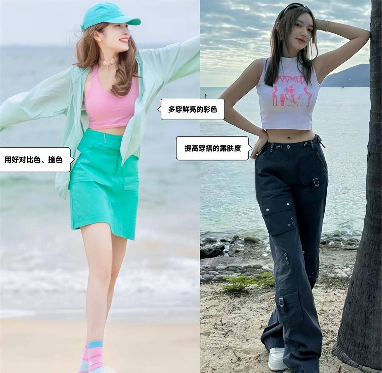在海边、沙滩时,周边气氛狂热而自由,穿露肤度高或彩色的服装更出彩。彩色服装就用对比色或撞色思路搭配,记得用露肤或无彩色单品中和;在肩颈、腹部或腿部提高露肤面积,拍照也很出片~