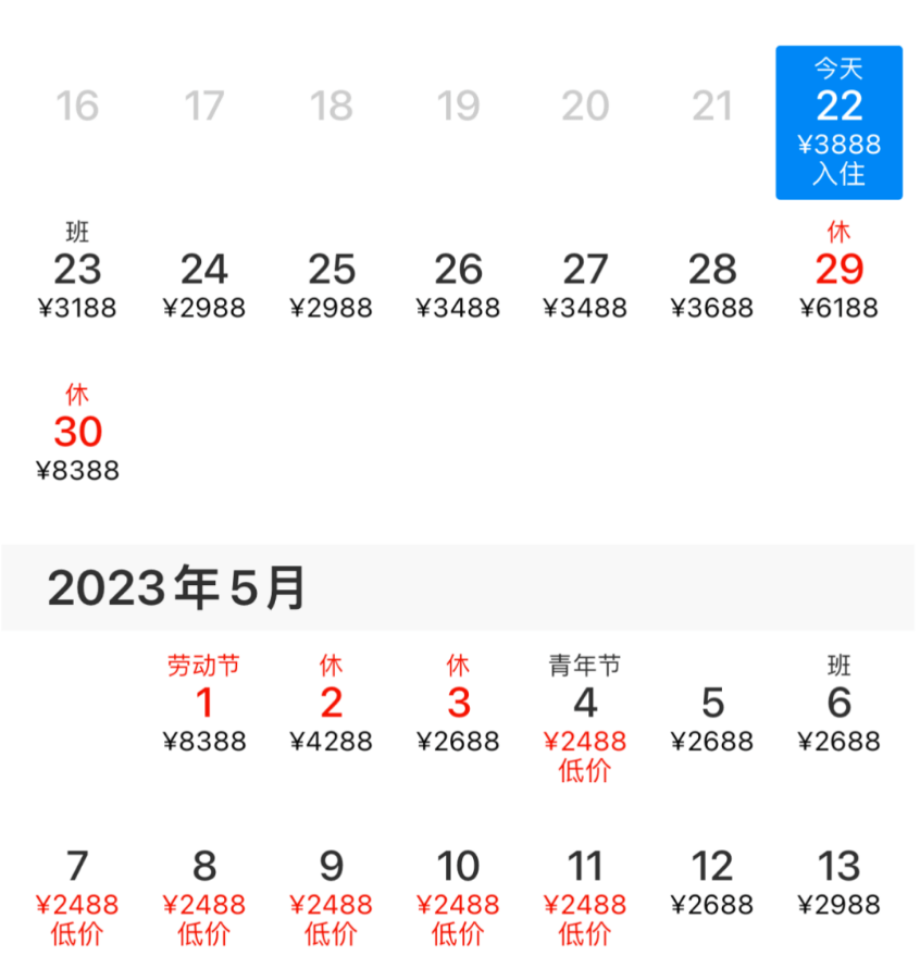 三亚某酒店4月、5月平日最低房价为2488元/晚,目前4月29日能够入住的最低房价为6188元/晚,4月30日和5月1日的最低入住价格达8388元/晚。