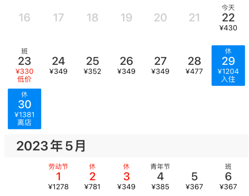以苏州观前街附近的酒店为例,平日最低房价约350元/晚的某连锁酒店4月29日最低入住价格为1204元/晚,是平日价格的3.44倍;4月30日的入住价格为1381元/晚,是平日价格的约3.9倍。