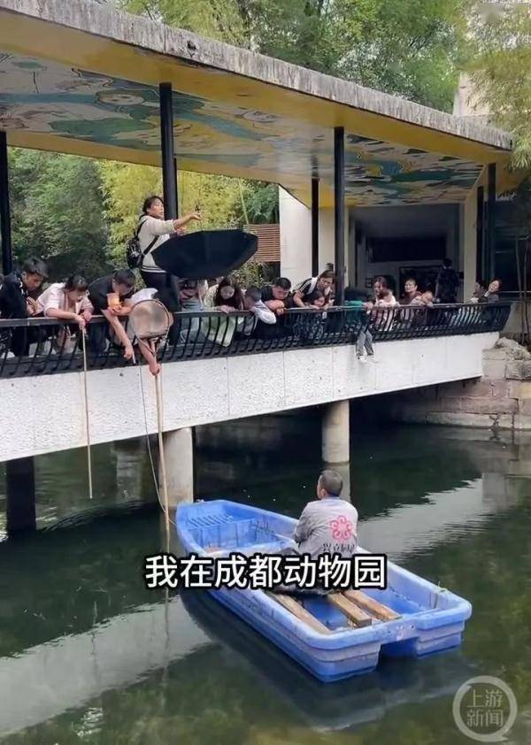 网传视频显示,一座廊桥上,有人弯身拿着杆子在下方水池里打捞,不少游客围观。下方水面上,有人坐在塑料船上看着,没有其他动作。“我在成都动物园发现了一个非常喜剧的事,最开始我从背面看,以为他们是在看池塘里面的鱼,看了好久才发现是在捞手机。下方的工作人员望着他们。据说要给500块,才下去帮忙。”发布视频的网友这样表示。
