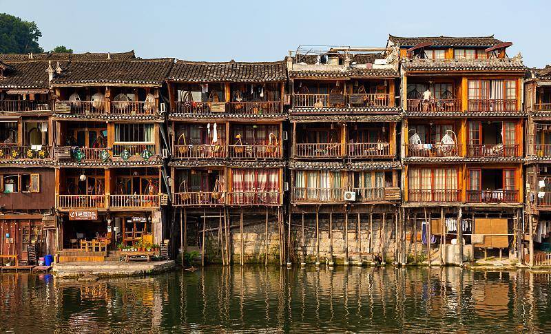 凤凰古城是一座保存完好的古城,其建筑风格典雅精致,充满了浓郁的湘西地方特色。在凤凰古城中,你可以欣赏到众多的明清古建筑,包括清代的官衙、茶楼、府第、民居等建筑,这些建筑充满了传统的木雕、石雕、砖雕和彩绘等工艺品,尤其是各种精美的门窗、楼梯和屋顶,让人们感受到了传统手工艺术的魅力。