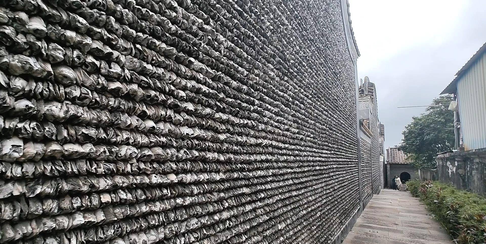 蚝壳墙是岭南建筑中比较独特而别致的工艺。多出现在珠三角一带。古时候的岭南基本都是海洋,由于气候很适合海洋动物的生存,没有天敌,生蚝在浅滩得以大量繁殖。随着岭南地区得以开发,生蚝进入了人们的视野,由于解决温饱而开始进入人们的餐桌,家家户户基本都在吃,将里面的肉吃过之后,剩下又硬又厚的外壳也是没什么用了,虽然可以被泥土降解,但是对于生蚝消耗量大的地区来说,大自然的降解速度肯定是跟不上人类的养殖速度和吃生蚝的速度,于是古人开始尝试着用食用完的生蚝壳搞建筑。生蚝壳就这样被就地取材,再加以辅料,建成了一间间的祠堂,一间间的民宅。