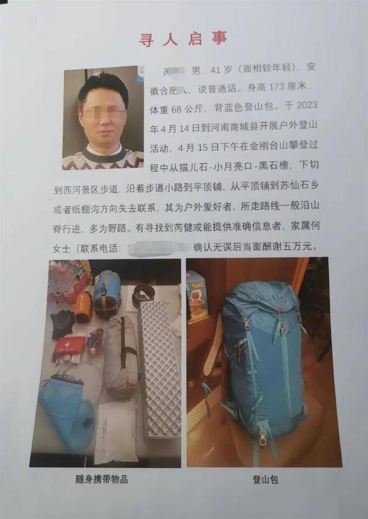 4月23日,极目新闻记者从芮先生的家属何女士处获悉,芮先生当天依然失联。据家属描述,芮先生今年41岁,是安徽合肥人,身高173厘米,体重68公斤,失联时背着蓝色登山包。芮先生于4月14日到河南商城,15日下午在金刚台山攀登过程中途经猫儿石、小月亮口、黑石槽,下切到西河景区步道,沿着步道小路到平顶铺,从平顶铺到苏仙石乡或者纸棚沟方向失去联系。其家属表示,芮先生是户外爱好者,所走路线一般沿山脊行进,多为野路。