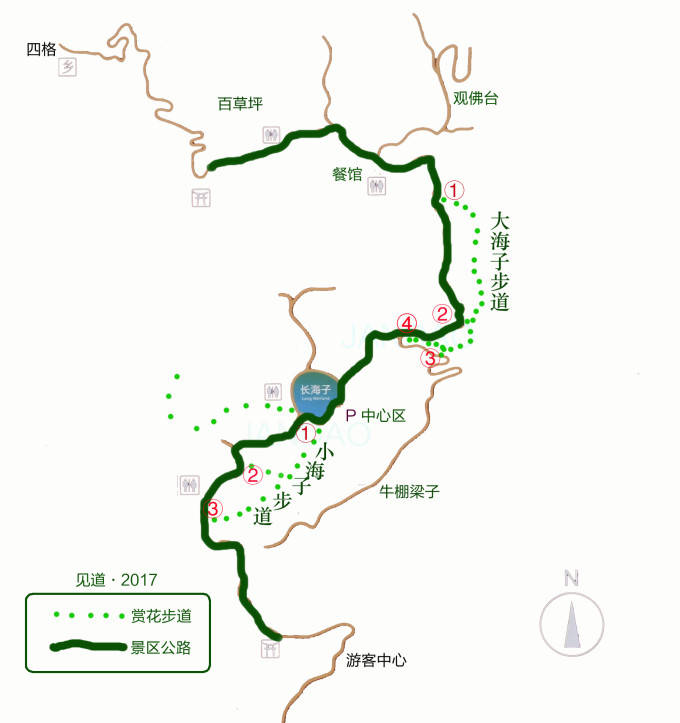 从我们扎营处附近的观佛台起向外走,即景区大门方向,一路上的主要观景点依次为佛光观景台,大海子步道(1号至4号入口)、牛棚梁子(支路里)、 长海 子、小海子步道(1号至3号入口)。