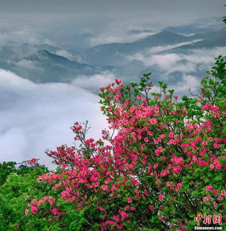 近日,浙江省安吉县云上草原景区的高山杜鹃花和云海奇观相映成趣,勾勒出一幅美不胜收的画卷,随手一拍,每一张都是赏花大片,成为一处江浙沪游客心仪的网红打卡点。图为云上草原景区。云上草原景区 供图