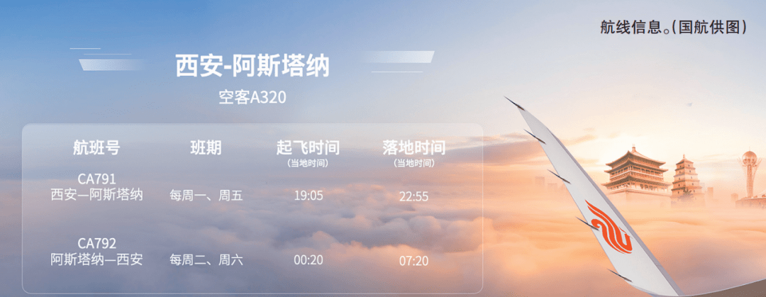4月21日19时19分,首航航班从西安咸阳国际机场启程前往阿斯塔纳。西安-阿斯塔纳航线是国航在西安开通的首条赴哈萨克斯坦定期远程国际航线,机型为空客A320,首航航班共有63名旅客,航班号为CA791, 每周两班,每周一、五执飞(起飞时间19:05-落地时间当地时间22:55)。