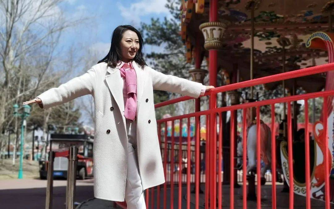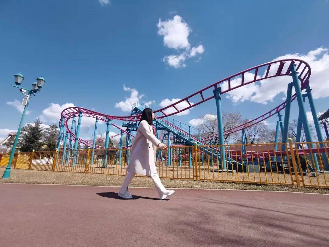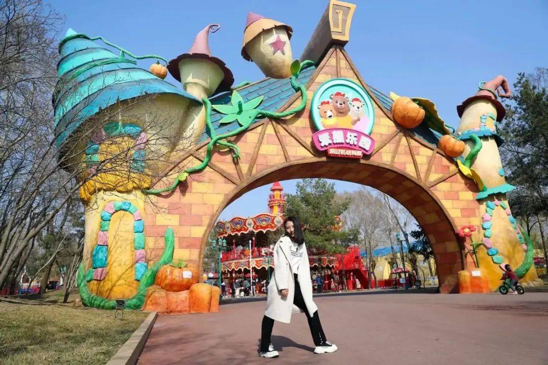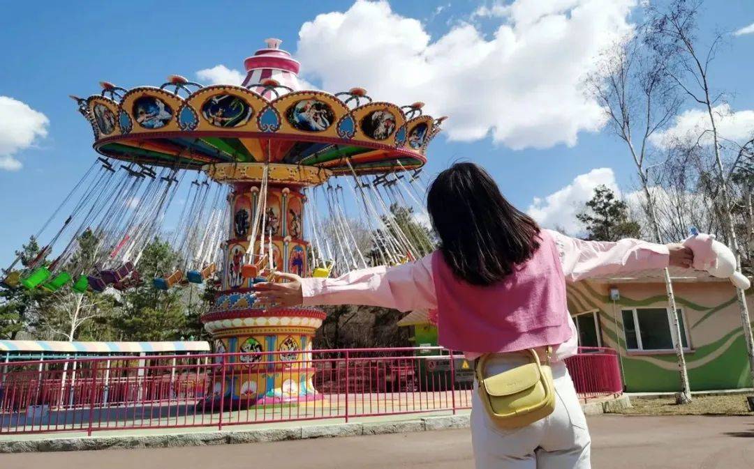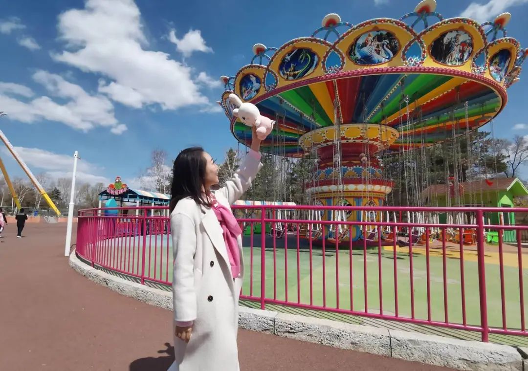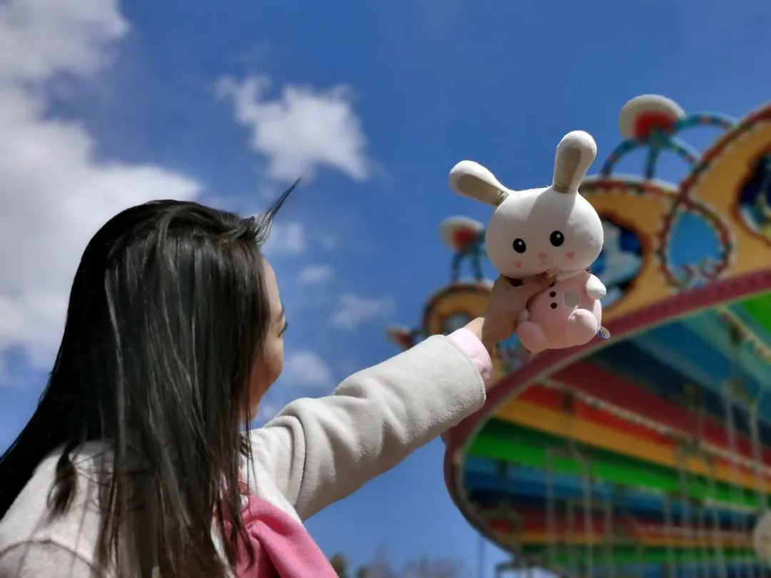 在笨熊乐园游乐设施前,游客可以单手拿着小道具,脸部转向手中道具方向,闭上眼睛拍下背景虚化的照片,这样即使是侧脸照也会让人,把眼神注视到人物身上。