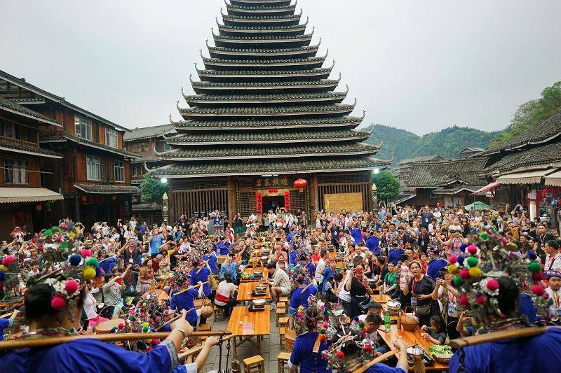 程阳八寨景区平寨鼓楼坪“百家宴”活动现场。谢子聪摄