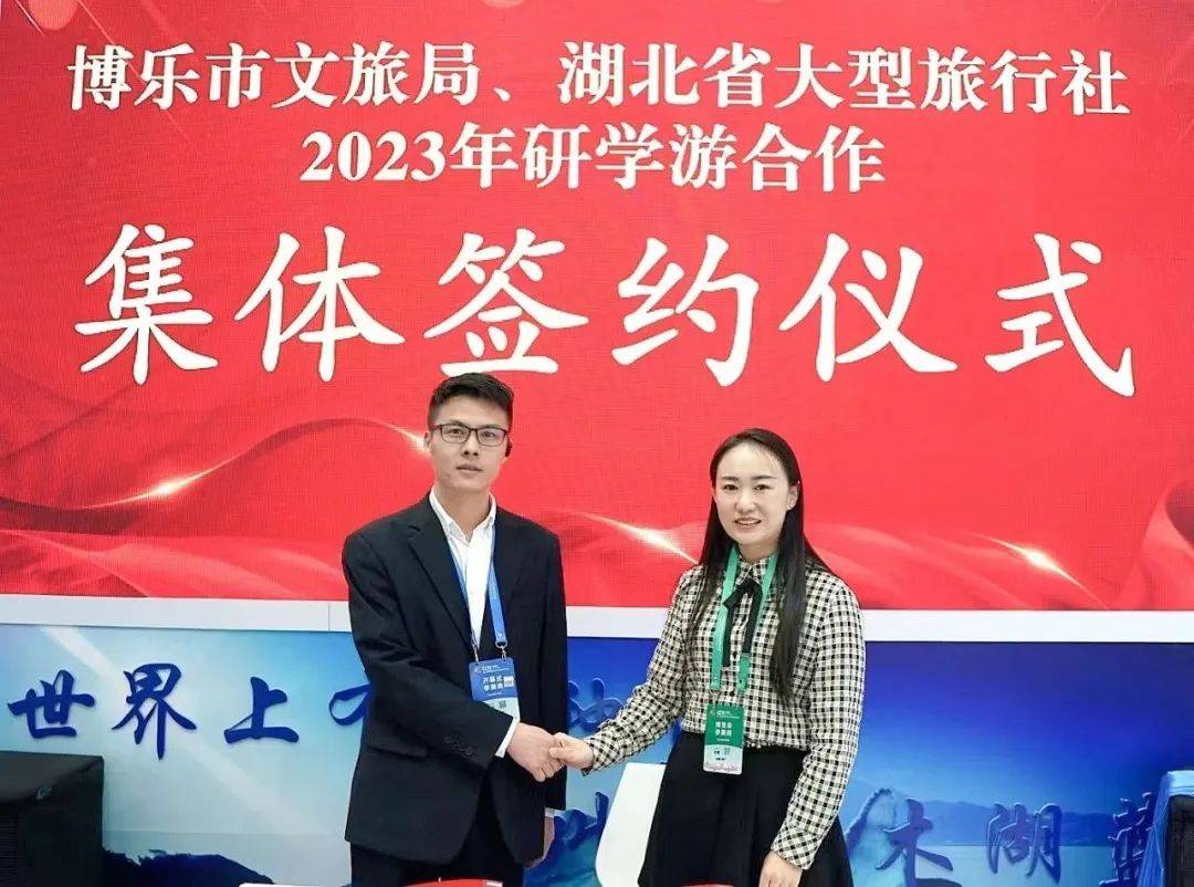 4月22日,博乐市以现场签约方式与湖北行摄天下国际旅行社有限公司、湖北金桥假日国际旅游有限责任公司、湖北省中国旅行社有限责任公司、中青旅湖北国际旅行社有限公司4家旅行社达成推广战略合作协议,旨在推动两地旅游业资源共享、优势互补、客源互送,进一步拓展疆内外客源市场和招商引资渠道。