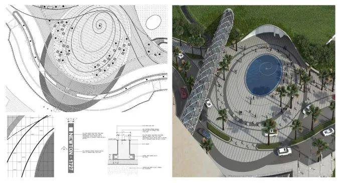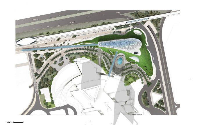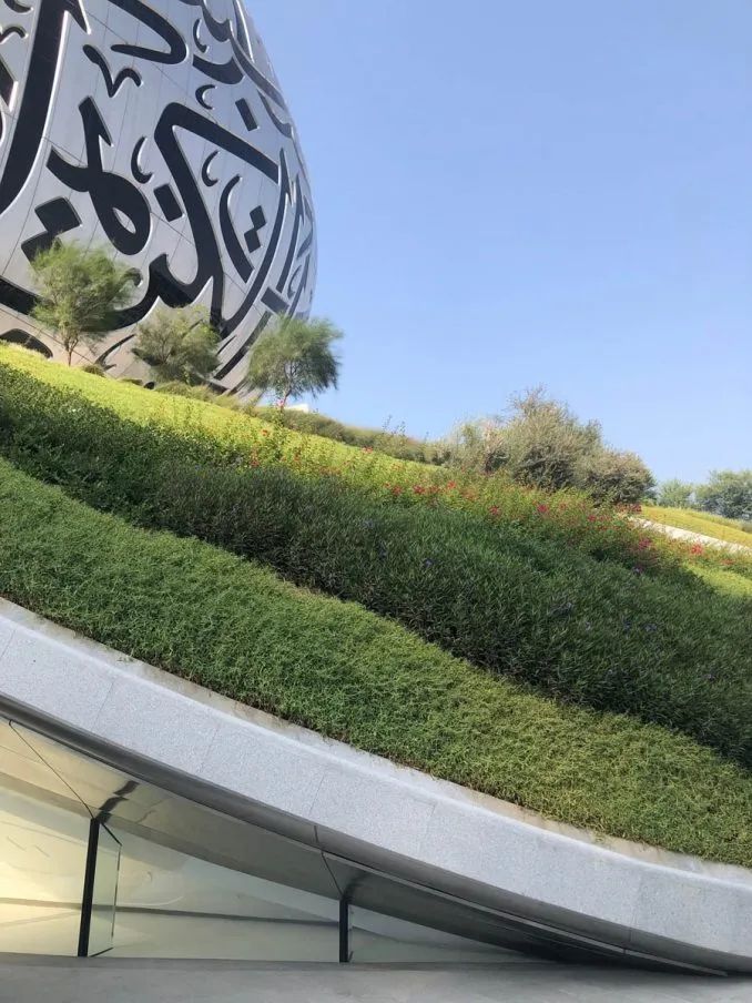 连接地铁的桥梁穿过景观并进入博物馆。在入口广场,游客会发现一个宁静的镜池,倒映着建筑的阿拉伯铭文;从游泳池中心开始,一条时间线盘旋进入建筑,象征着过去思想的演变,并进入等待未来的博物馆。戏剧性的入口与景观融为一体,营造出和谐的建筑形式。