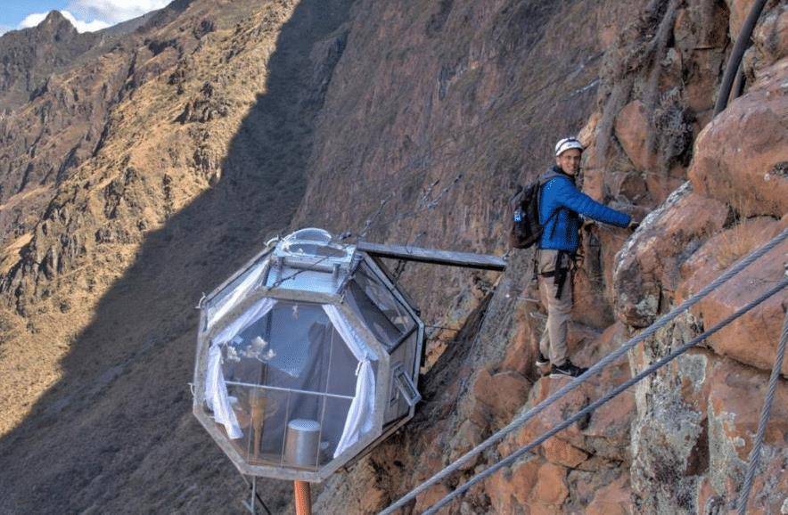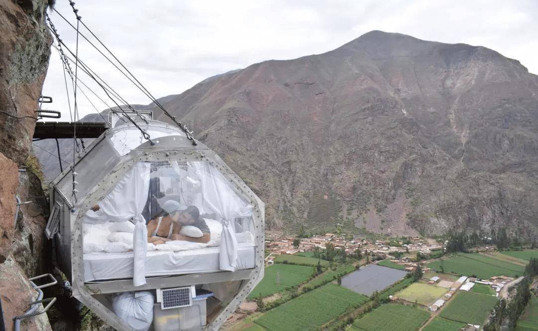 这座酒店就在秘鲁的一个山谷之中,它就是由三间半透明胶囊屋组成,全部都悬挂在百米悬崖之上。房间距离地面有120米高,旅客想要抵达房间,要么从悬崖下方攀岩而上,要么在悬崖对面乘坐滑索滑行过来。光是抵达房间就足够刺激了,更不要说在房间中睡觉了。