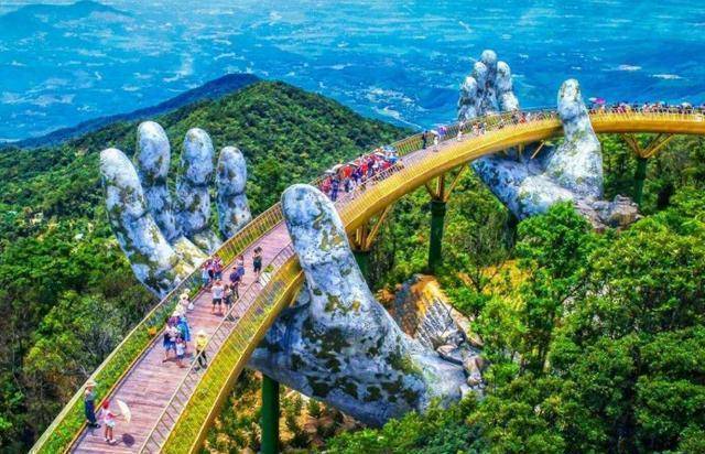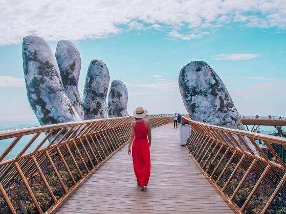 首先第一双手托起的金桥就是位于越南岘港的岘港金桥,这座金桥设计得非常的特别,是一双巨大的佛手托着一个150米长的金桥。这个金桥的造价非常之高,达到了20亿美元,在2018年6月份才正式对外开放。这座桥建设好之后,很快就成了越南的网红景点,吸引了众多的游客前来这里游玩。