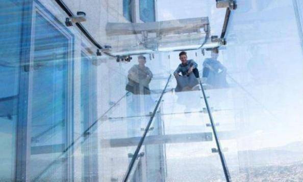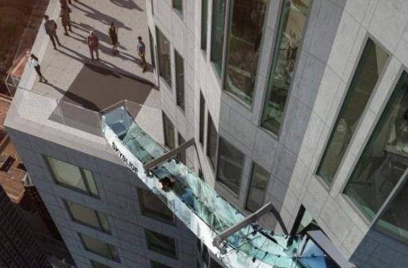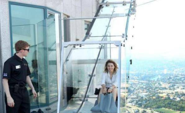 这个滑梯位于美国市中心的一座摩天大楼之上。滑梯建造于大楼的最外侧,滑梯全是由透明的玻璃制造而成。当然这种玻璃不是普通的玻璃,是一种高强度的特质玻璃,非常的坚固。滑梯的底部和上面也是由几根巨型的钢柱支撑的,非常牢固。
