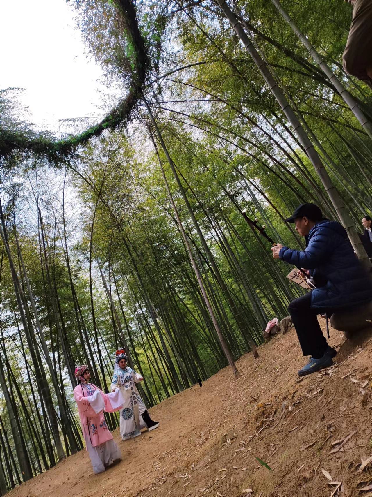 飒飒竹风和松阳高腔让人动容,穿着戏服的人影影绰绰地站在竹林中,让人分不清真与幻,分不清古与今。诗人们写下:“阳光穿过竹叶,打在湿漉漉的泥地上/就像刀刃,戳在那里/竹叶的影子,反衬得刀刃更亮/光与影来回滑动,寂静中它们似乎发出了唰唰的响声。”(蓝野)“竹林剧场,一阵松阳高腔/《马房招亲》,铿锵插了进来/仿佛今古之间忽地横了一个坑/正应和“横坑”这个地名/尔后,竹梢窸窣、喧哗/编织出日光与月光的穹顶。”(沈苇)