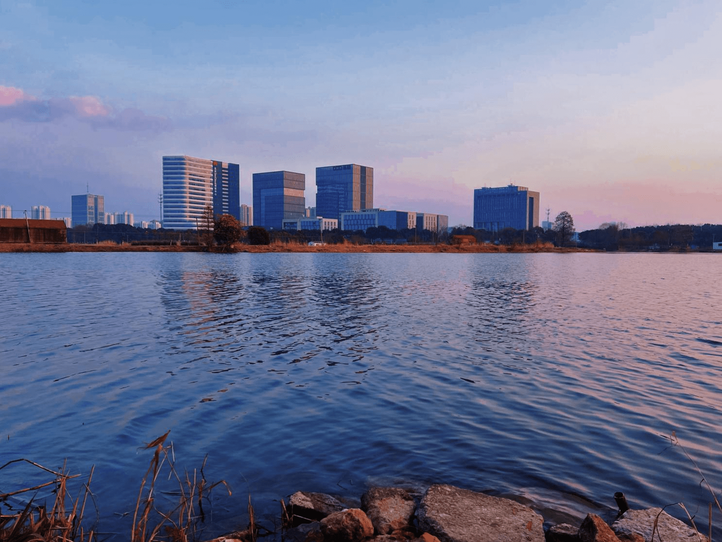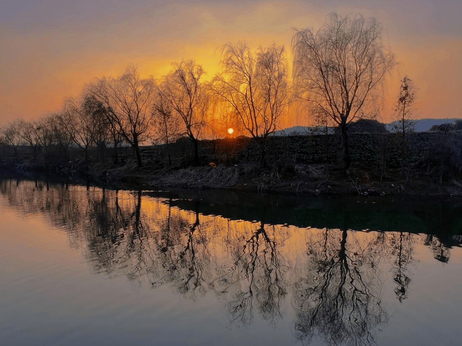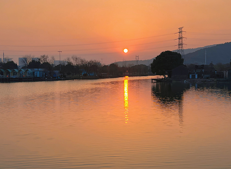 湖面的红日,还未消散它的余韵与光芒,随着时间的推移在半梦半醒中缓缓降落,水天一色波光粼粼。