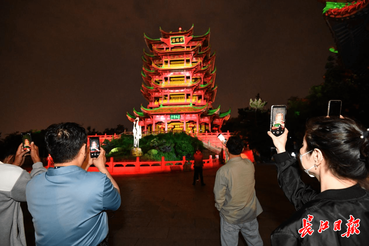 长江流域重点新闻网的总编辑们站在西广场观看黄鹤楼主楼光影秀。长江日报记者何晓刚 摄