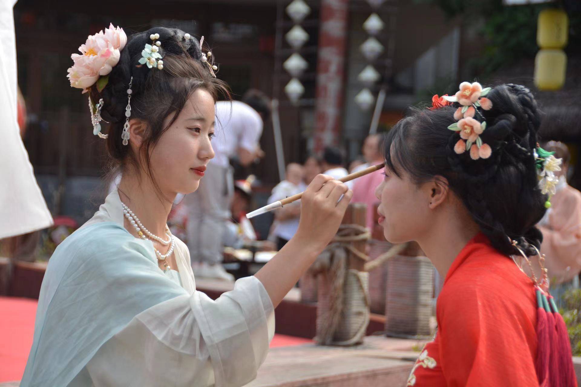 活动现场准备了煮好的鸡蛋供大家体验上巳节吃鸡蛋悼念祖先以及去除病痛等方面的习俗。又见他们依次排好队进行“净手”“沐兰汤”等以去除污垢和病痛演绎上巳节文化“祓禊”,向参加活动的人员免费画花钿演绎上巳情人节青年男女打扮出行。
