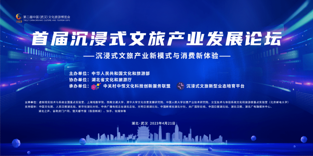 为贯彻落实党的二十大精神,实施国家文化数字化战略,凝聚行业共识和力量,推动沉浸式文旅新业态高质量发展,2023年4月21日,在第二届中国(武汉)文化旅游博览会期间,由文化和旅游部主办的首届沉浸式文旅产业发展论坛在武汉举办。