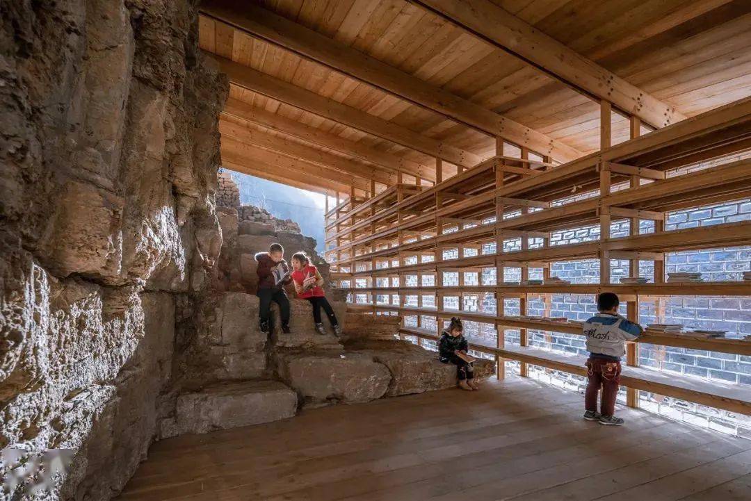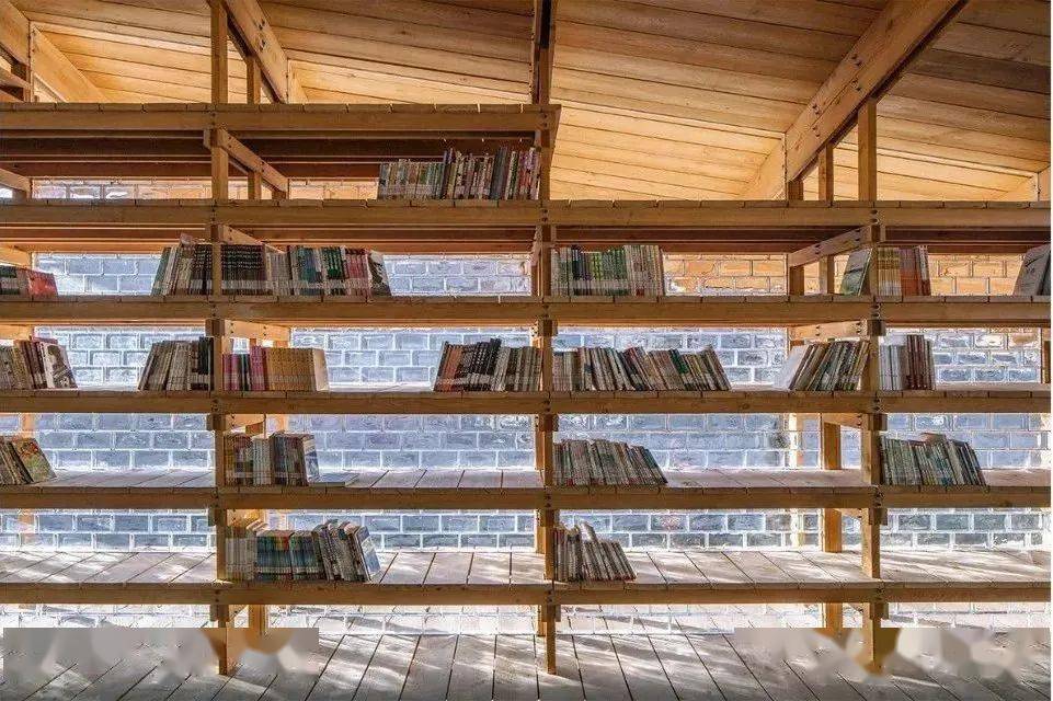 书屋内没有桌椅和板凳,层叠的岩石稍加打磨,放上一个个藤编垫子,就成了孩子们的阅览区。书屋的入口处与对面的墙,用玻璃搭建而成。木框架构成的承重墙,中间嵌入玻璃砖,室内部分被用作书架,户外部分成为人们休憩的座椅。白天,自然光透过玻璃,让人们能在阳光下尽情阅读;晚上,室内暖光亮起,书屋又成为静谧村落的一道风景。书屋不仅丰富着人们的精神生活,还增进了村民之间的情感交流。