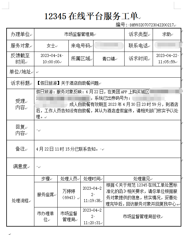 4月22日11:20,区市场监督管理局收到12345在线平台服务工单,内容为消费者在美团APP上购买某酒店自助餐票,到酒店后被告知没有自助餐,认为酒店虚假宣传。我局第一时间受理并进行应急处置。