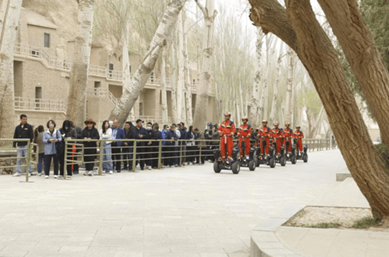 随着“五一”假期临近,敦煌市旅游持续升温,身着橙黄色抢险救援服的敦煌市消防救援大队指战员在莫高窟景区巡护执勤,宣传消防安全知识。