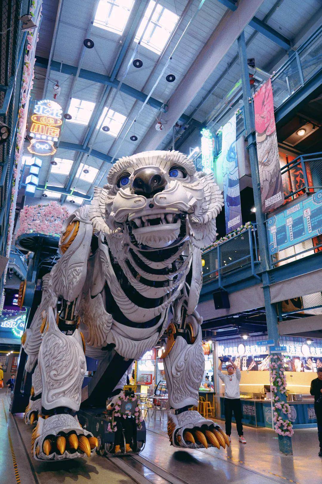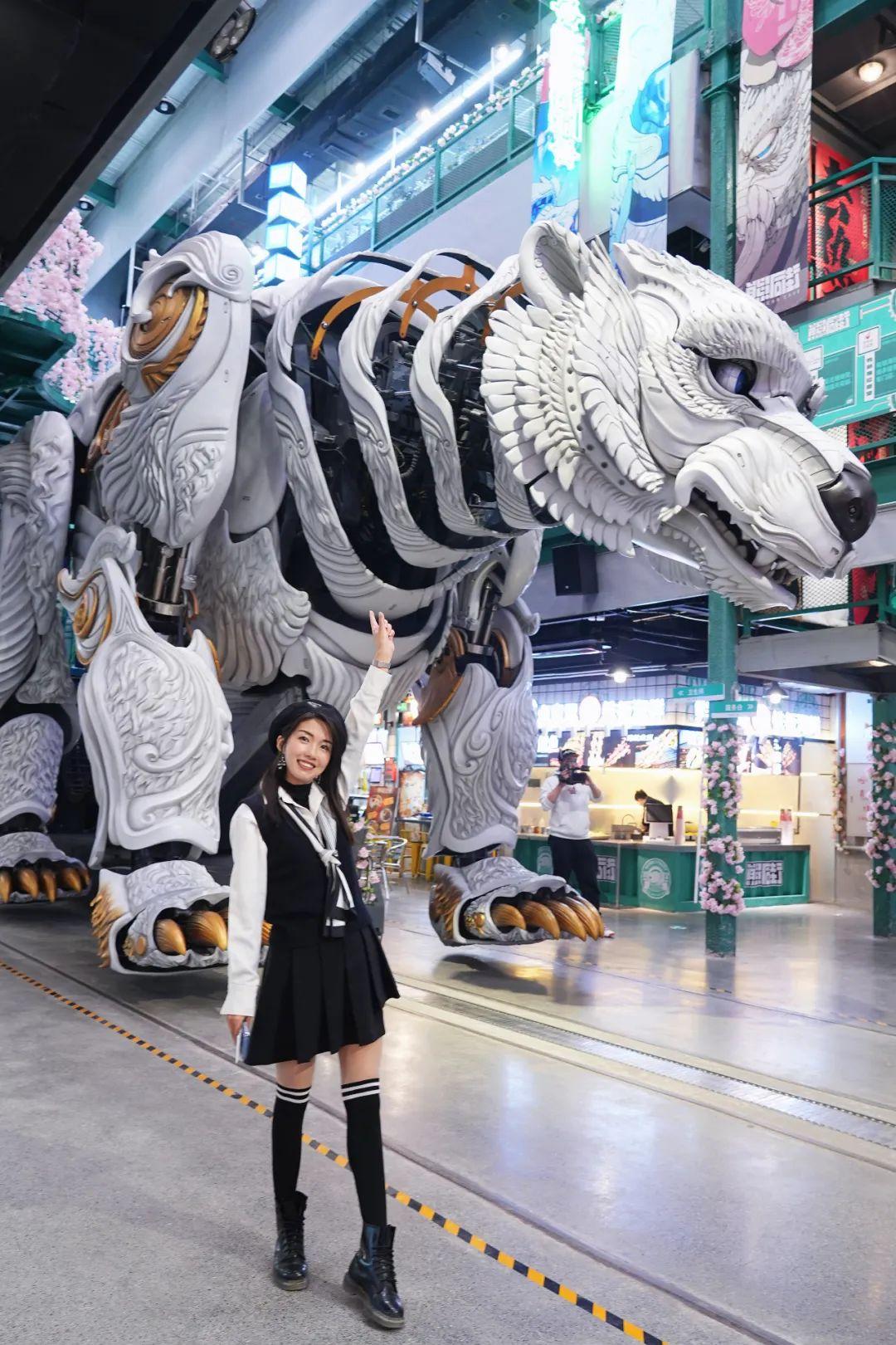 这个是熊洞街的原创IP机械,高6米,重25吨,表演大秀动作活灵活现,当它缓缓向你靠近,一声巨吼的震撼感与沉浸体验值达到满分。