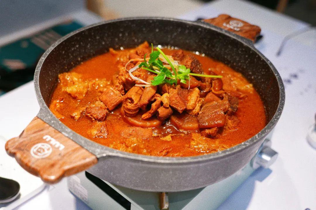 这是一家连锁餐厅,人均70元左右,在广州、淮安、沧州等城市都有加盟。我们点了推荐的鱼腐油焖肥肠鸡噜噜煲,火山牛腩噜噜煲。