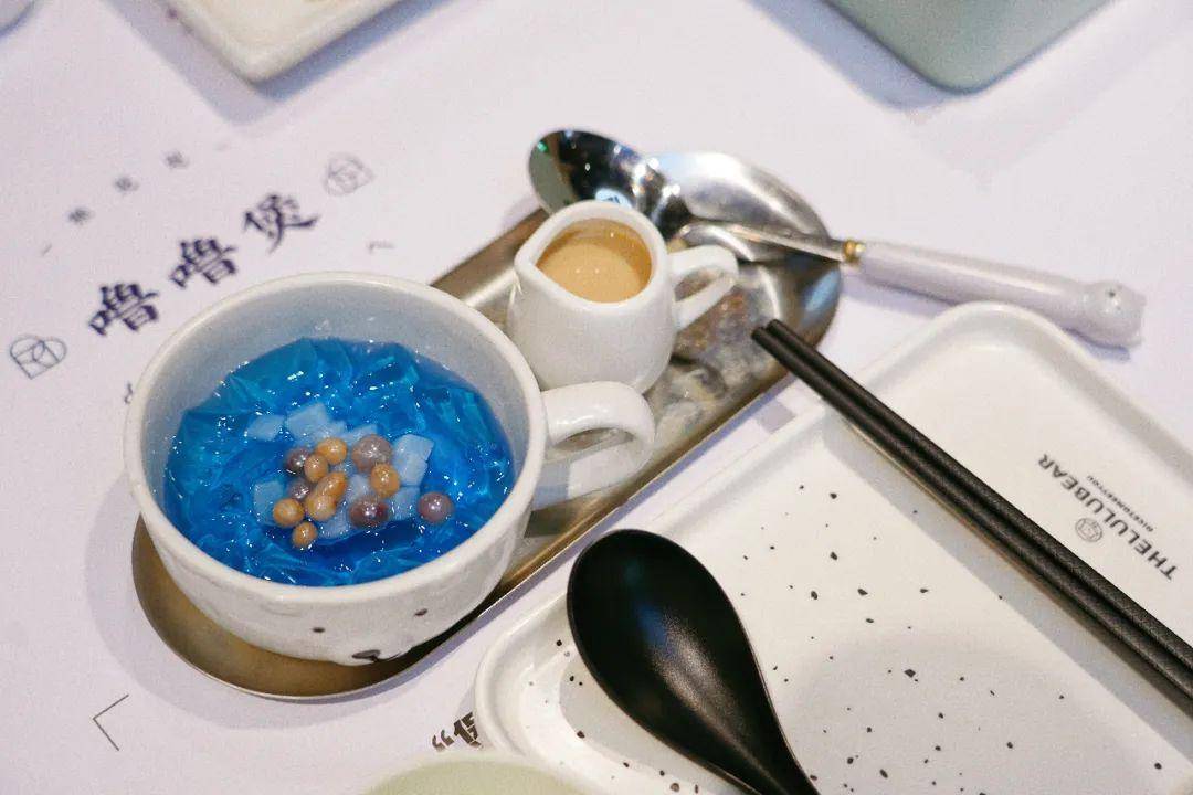 蓝色的冰粉颜值很高,连汤勺都是小熊造型。