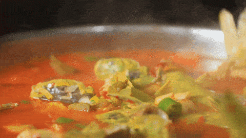 用西红柿和红辣椒打碎发酵而成的自酿红酸汤是锅底的灵魂。热锅入油,调料爆香,取两勺红酸汤和本地欧休菜(酸菜),加适量清水微微煮开,再放入鱼肉下锅煮熟,撒上辣蓼草,一锅喷香的酸汤鱼便制作完成了。