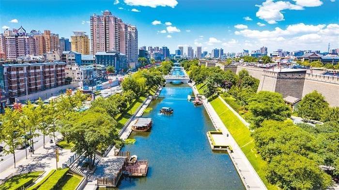 蓝天白云下的西安城墙景区宛若画卷(资料照片)
